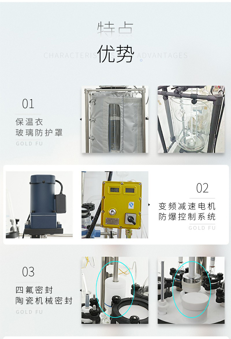玻璃雙層反應釜為雙層玻璃設計,內(nèi)層放入反應溶媒可做攪拌反應,夾層可通上不同的冷熱源(冷凍液,熱水或熱油)做循環(huán)加熱或冷卻反應。在設定恒溫條件下,在密閉的玻璃反應器內(nèi),可根據(jù)使用要求在常壓或負壓條件下進行攪拌反應,并能做反應溶液的回流與蒸餾,是現(xiàn)代精細化工廠、生物制藥和新材料合成的理想中試、生產(chǎn)設備。
